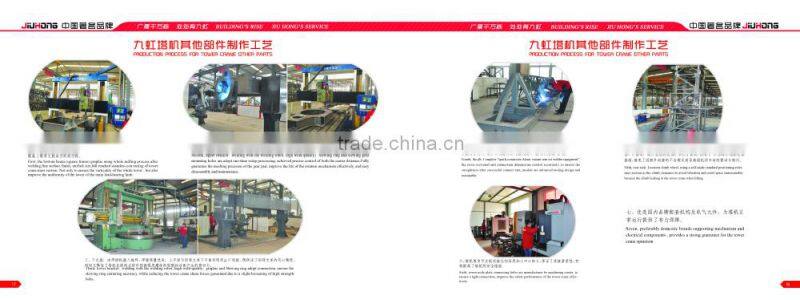 Ace Tower Crane QTZ for sale in China , ranging from QTZ31.5 to QTZ500 (Max Load=3T-25T), is among CHINA Jiuhong’s leading products.With their working radiuses varying from 30m to 80m, QTZ tower cranes are famous for their large operating ranges, varied working methods and wide uses. This series of tower cranes has a horizontal jib frame, a jib-trolley radius-changing mechanism and a hydraulic self-raising mechanism. It is original in design, reliable in operation and satisfactory in shape. Equipped with all necessary safety devices, these cranes show a good speed-control capacity, satisfactory operating stability and high work efficiency. They can be widely used for the construction of high-rise hotels, residential buildings, high-rise industrial buildings, large-span factory buildings and tower-like buildings like tall chimneys. The QTZ series tower cranes have been awarded many honors like “CHINA FAMOUS BRAND”. “QUALITY FIRST” is not only a slogan; it is deeply rooted in the hearts of Jiuhong people. We also provide excellent after-sale service which will get rid of all your worries in the purchase of our products.