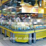 Our factory supplies all kinds of supermarket equipment, such as wooden display shelves, metal shelves, shopping trolley/cart, shopping basket, checkout counter, promotion table, vegetable & fruit rack, etc.