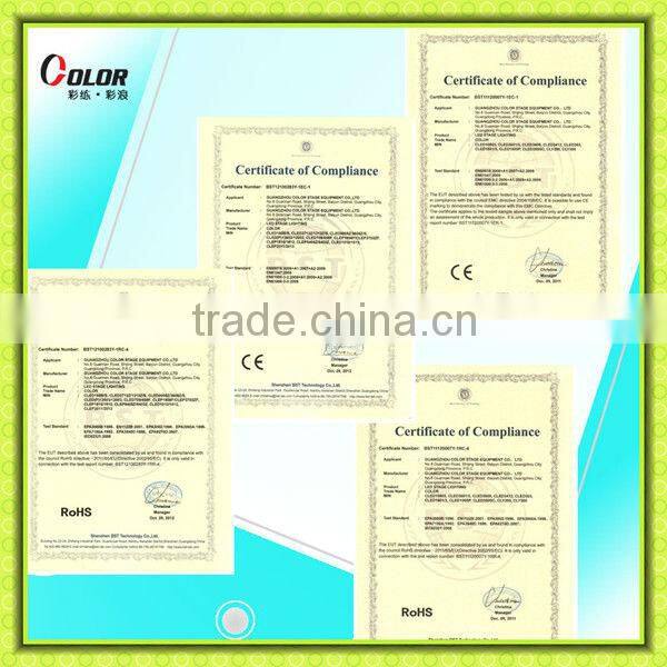Guangzhou Color Stage Equipment Co., Ltd. specializes in researching, designing, manufacturing, marketing and after-sale service of professional stage lights.Our company has succeeded in passing the quality of authentication of ISO9000:2000.And all our products are CE and Rosh compliant .We have been the director of 'China Performing Arts Equipment Technology Association', and we have been assessed second-rank undertaking in general capability of professional lighting-project technology .For more information,pls visit