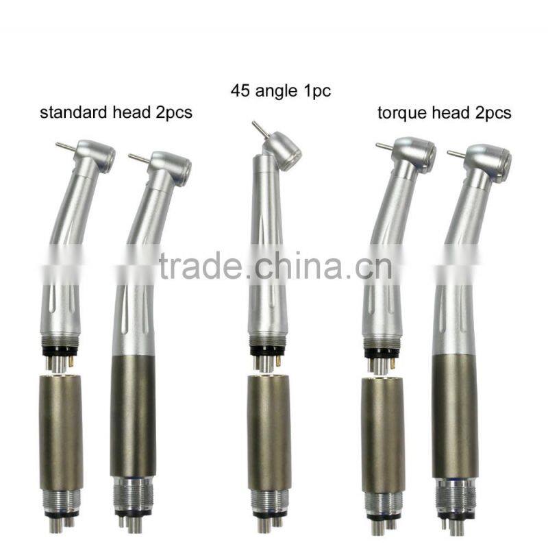 It has 2pcs torque head, 2pcs standard head and 1pc 45 angle handpiece, one set can be used for two dental chairs;