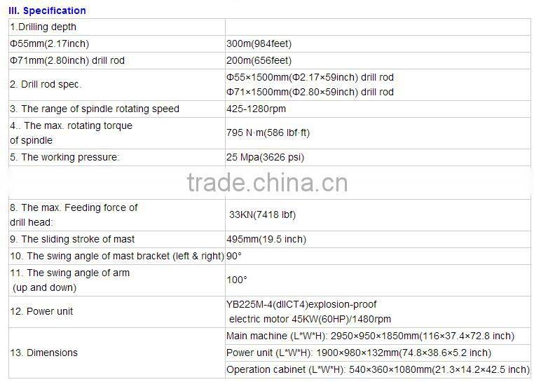 2. The hydraulic pump is driven by explosion-proof electric motor, to make drill head rotate. At the same time, the movement of drill head is realized by oil cylinder & chain double speed mechanism.