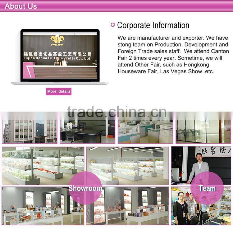 Fujian Dehua Full Win Crafts Co., Ltd. was founded in 2006 and is located in the famous porcelain capital of China – Dehua. We have our own design team, production team and sales team. Our company trades as one of the highly export-oriented enterprises. Our newly developed products have strong market competitiveness at home and abroad. More than 90% of our products are sold in the United States, Canada and other countries and are well received by customers. Our products mainly include Ceramic (all seasonal gifts, such as Christmas, Valentine's Day, Easter, Mother's Day, Teacher's Day, Halloween, Harvest Festival and more); Stoneware commodities (bowls, plates, cups, saucers, pots, sealed cans, sanitary ware, flower pots and so on). We welcome foreign trade companies, import and export companies, OEM customers, wholesalers and other customers to cooperate with us. We have full confidence to offer you the most competitive price, superior quality, prompt delivery and the most satisfactory service.