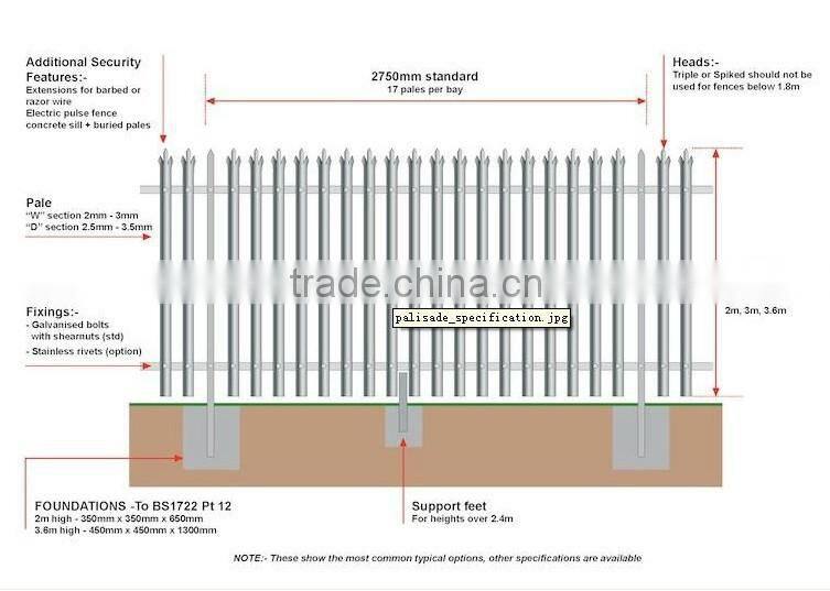The security level of palisade can be increased by increasing the height of the fence, increasing the number of pales per panel, increasing the thickness of pale, adding a concrete plinth.