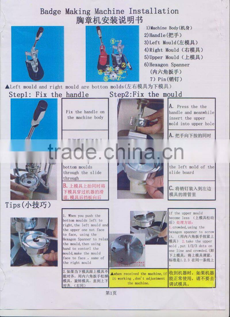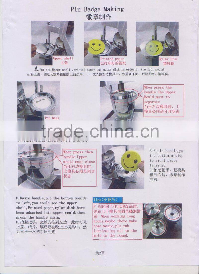 Badge making machine can make several kinds of your own artwork for money or for fun. It can produce different sizes of pin buttons,rope ties,key holders,mirror key holders,can opener and so on. We have different size of round molds which suitable for this machine. All these moulds are using the same badge machine body. The molds are interchangeable.