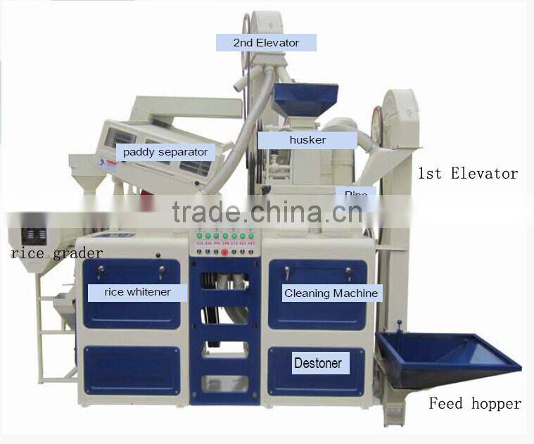 Unprocessed food grains are poured into the feed hopper and elevated by single elevating conveyor to cleaning sieve,big and small foreign matters of unprocessed food grains will be cleaned up; cleaned grain will be elevated by double elevating conveyor to Husker to shell;rice shell will be conveyed by the crude bran separator to the exterior of machine or collect by Cyclone; mixture of paddy and unpolished rice will be elevated by double elevating conveyor to gravity paddy separator to carry out the separation of grain and bran;separated material including: one is material which including more paddy, these material will return to husker through double elevating conveyor to shell again,the second one is mixture of paddy and brown rice, these material will return to paddy separator by double elevating conveyor, the last one is clean brown rice,hese material will into rice mill to whitening. The fine bran out of whitener will be collected by a fine bran cyclone, and the rice out of rice outlet mouth is the finished rice.