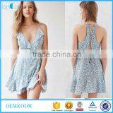 Summer New Design Women Printed Blue Ruffle Wrap Mini Dress