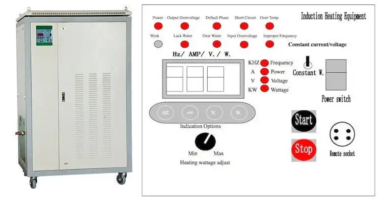 • Wide frequency range from 1KHZ to 20KHZ, working frequency can be designed by changing the coil compensating capacitor according to the melting material, quantity, stirring effect desire, working noise, melting efficiency other factors.