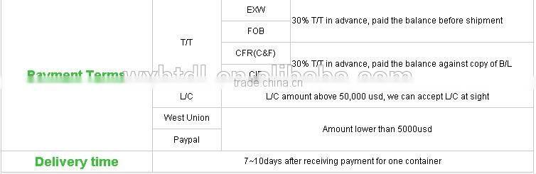 A: Payment<=3000USD, 100% in advance. Payment>=3000USD, 30% T/T in advance ,balance against the copy of B/L.