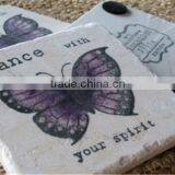 A:Our marble cup mat and sandstone cup mat are processed with meticulous cutting, polishing, manual drawing, into a cute cup mat, mural artware product, delicate patterns, featured with simplicity and nature, or vintage style, or modern style, colored with black green, beige, rusty and etc. It is a new natural green product. The standard dimension of cup mat is about 10*10*1cm, weighs about 200g, favoured by white-collar workers, on the table, in the office, and more that, it would manifest one`s personality, to give a expression of talents in modern city. And it also can be used as a media for enterprise propaganda, or product items promotion.