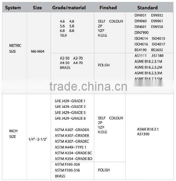 DIN933 & DIN934 Hex Head Bolt and Nut OEM(ISO9001-2010) Grade 4.8/8.8