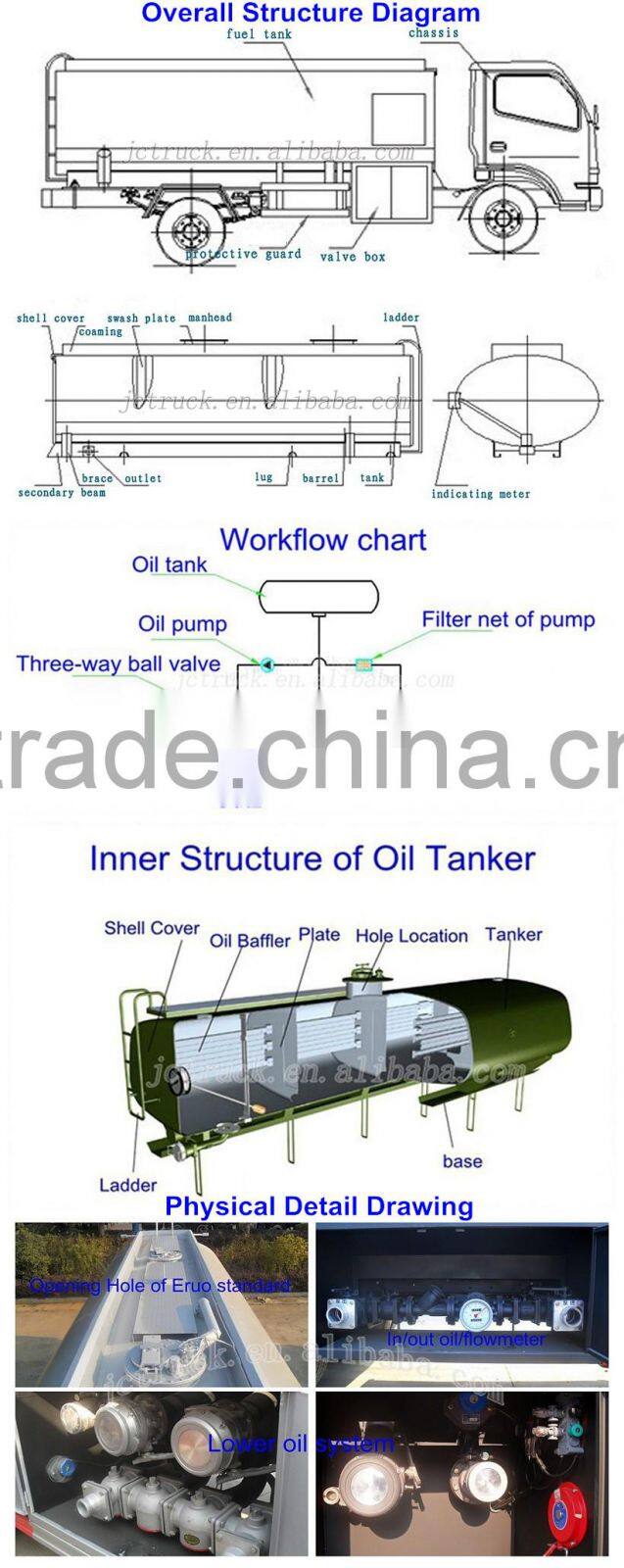 | Modified Description | 1. .Tanker material:4-6mm carbon steel, stainless steel,aluminium alloy and pure aluminum cans(according to different requirements) 2. Separate parts for different oils,out and in through pump,self-flow.Optional equipment:flowmeter,computer tax-controlled tankers,15m TLJP(self-return), emergency shutdown device.Multichannel wave plate in tanker. 3. Equipped with self-priming pump,gear pump,double pump. | |||