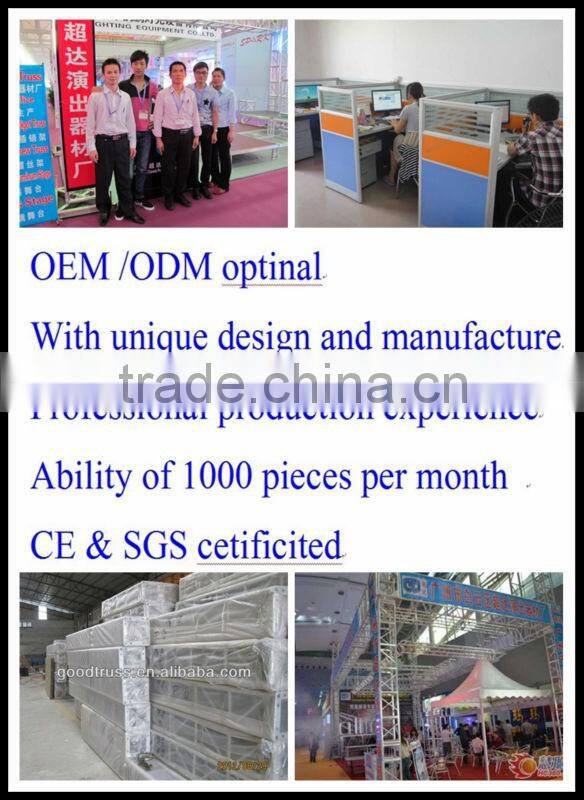 Guangzho Chaoda PERFORMANCE EQUIPMENT CO., LTD is a professional design, production and sales as one of the stage equipment company.Its products include various specifications and types of aluminium alloy ltent, aluminum trusses, stage stents, stage it was lifting, exhibition shelf, TRUSS plane, iron rack, H frame, background frame and activities stage, transparent glass stage, stage, can tear open outfit stage, fold stage, and so on, can according to customer special requirement.