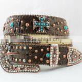 2015 Hot Seller Western Cowgirl Bling Rhinestone Leather Belt With Turquoise Cross Concho