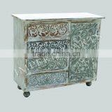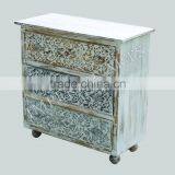 INDIAN WOOD WHITE FINISH CARVED DRAWER CHEST