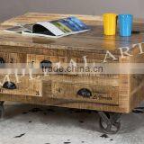 INDIAN MANGO WOOD 5 DRAWER CENTER TABLE WITH IRON WHEEL