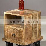 INDIAN MANGO WOOD 2 DRAWER SIDE TABLE WITH IRON WHEEL