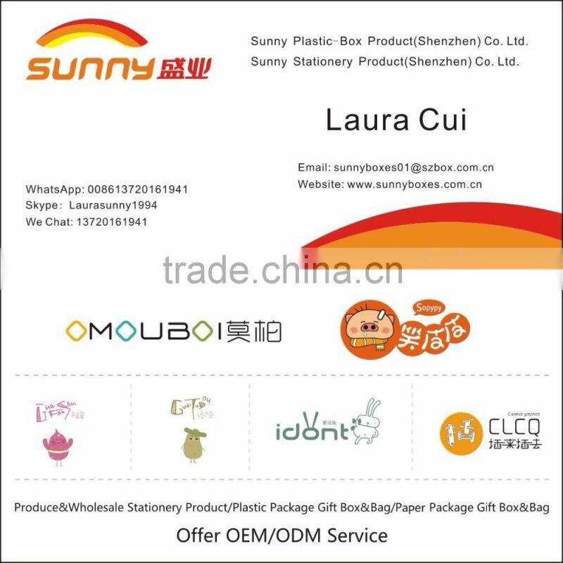 Sunny Plastic-Box Product (Shenzhen) Co., Ltd. specializes in the production of various kinds of PP, PVC, PET, PS,Paper,TYVEK Paper and PU products, including stationery products: file folder,expanding file,clip file,ring binder,clear file bag, zipper bag,photo albums,card holder/album, notebook, booklets; Plastic packaging boxes, Paper/PP/PVC shopping bag, Non-wowen shopping bag, handbag, backpack,cosmetic & storage bag/box and tyvek wallet,tyvek bag products etc...