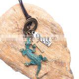 Vintage Genuine Leather Necklace With Bronze Green Lizard Pendant.