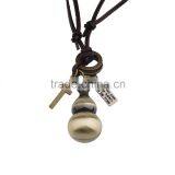 Vintage Genuine Leather Necklace With Antique Brass Gourd Pendant.
