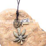 Vintage Genuine Leather Necklace With Antique Brass Maple Leaf Pendant.
