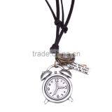 Vintage Genuine Leather Necklace With Antique Sliver Alarm Clock Pendant.