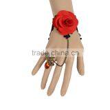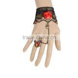 Chic Women Fashion Black Lace Bracelet With Red Rose Flower Alloy Chain Ruby Ring