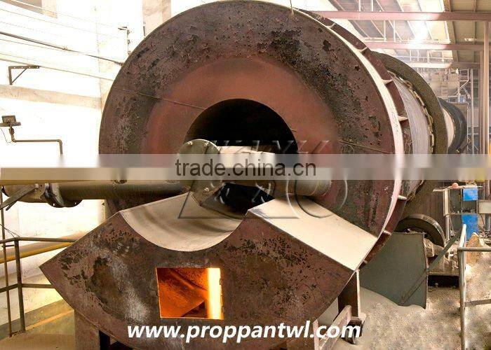6 producion lines provide an annual output of 210,000 MT proppants of different specifications. The raw materials are proportioned by the computer after being carried into the storage bins and crushed into powder by the cylinder ball mill, then, blown into storage bins through pipes in which the materials are fully mingled. Next, the powder is delivered to pelletizing workshop; get spraying pelletized by rotary granulators with diameter of 4m. The beads then are dried, dedusted and sieved by multi-functional screen.
