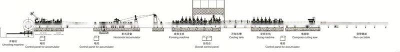 uncoiling machine--- butt-welder--- horizontal accumulator--- forming machine--- cooling tank--- sizing machine--- computer cutting saw--- run-out table