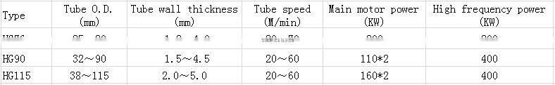 | Tube O.D. (mm)  | Tube wall thickness  (mm)  | Tube speed (M/min)  | Main motor power (KW)  | High frequency power (KW)  |