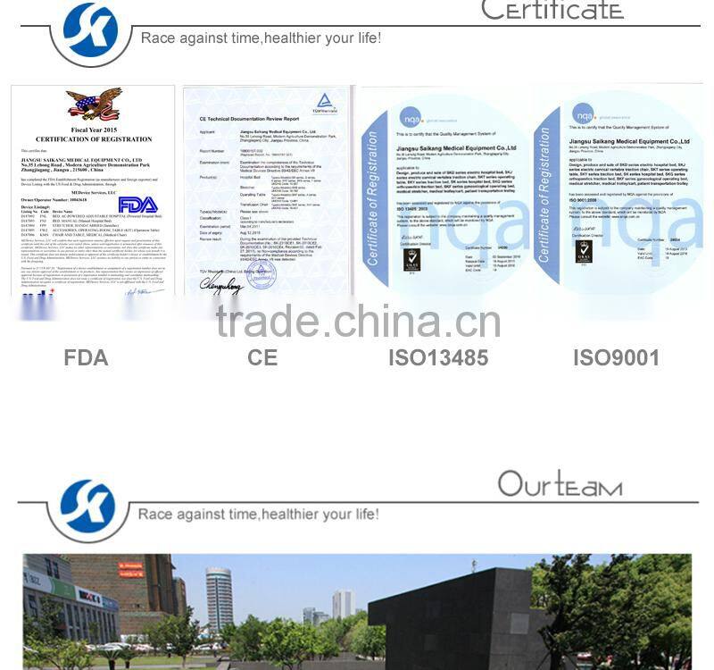 Our company has been established since 2002. We are located in Zhangjiagang City, along the Economic circle of Yangtse River Delta, enjoying the highly developed economic expansion and convenient transportation access. Our factory is combined with manufacture, sales, service, and support of some of the most innovative hospital furniture solutions. Managed by a professional team, with a wide range of managerial experience and business acumen in diverse fields, is a leading provider of highly specialized medical equipment and products such as electric and manual hospital beds, orthopaedics traction beds, exam tables, infusion chairs, accompany chairs, hospital trolleys, stretcher and stretcher trolleys, etc., registered in accordance with ISO9001:2000, ISO 13485:2003, CE and FDA approved. Besides all of these honored certificates, we pay more important care on our customers' satisfaction, which is the base to make our products popular worldwide. So far, over 60 countries and regions have enjoyed our products and services. Our success has been mainly achieved by following the corporate philosophy of being firmly committed to "Integrity is the base, Customer is the first". Our vision is to provide the world-class products and services to improve health-care system worldwide to the top level. Our mission is to achieve 60 percent of the market share in our product range. Hope you could enjoy our products and service in the quite near future.