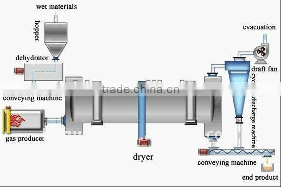 Coconut fiber with high moisture content are fed into rotary cylinder; shovelling plates inside the drum walls raise up materials and these materials scatter down to move in a spiral forward style. During the constant raising up and scattering down, wet sawdust can absorb enough amout of heat, at the same time, the drying time is extended to achieve the best drying effects.