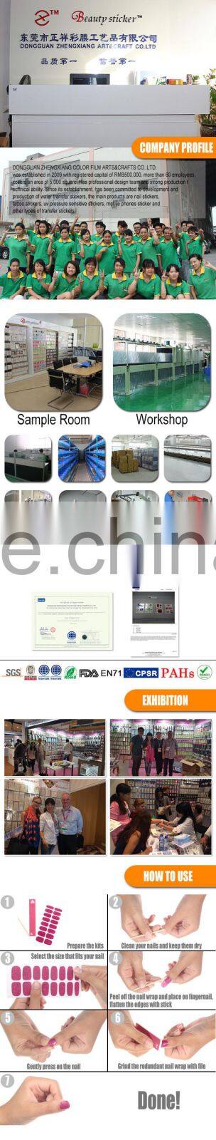 DONGGUAN ZHENGXIANG COLOR FILM ARTS&CRAFTS CO.,LTD. was established in 2009 with registered capital of RMB500,000, more than 60 employees, covers an area of 5,000 square. Has professional design team and strong production technical ability. Since its establishment, has been committed to development and production of water transferstickers, the main products are nail stickers, tattoo stickers, uv pressure sensitive stickers, mobile phones sticker and other types of transfer stickers Passed by SGS testing ,strictly inner quality control ,all products are qualified. devote to produce all kinds of beautiful transfer stickers, applicable to nail industry, cosmetics industry, toys, gifts and other custom design( OEM, ODM) Our products are exported around the world, and has been recognized by the majority of the industry. "quality first, credit first, service first" as our core values, All focus on the needs of users, continuous innovation, core technology, depending on the quality of life,Customer is God, dedicated to providing best quality and compettive price to all the customers. Especially, we have best after-sales service. Our company headquarters is located in Houjie Town, Dongguan City, Guangdong Province. Welcome to come to negotiate business anytime. skype: zxart01