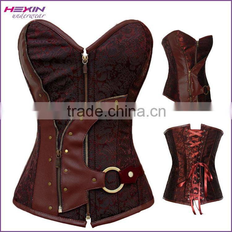 Brown Plus Size Waist Training Overbust Steel Bone Steampunk Corselet Front Zipper Corset Top
