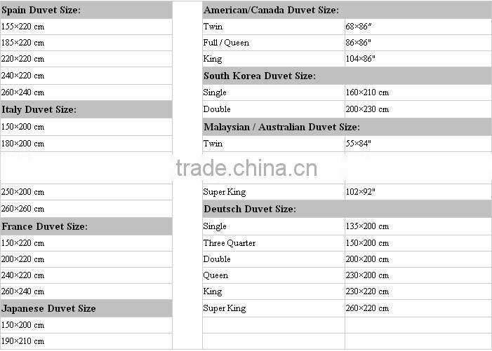 Regular Sizes of Quilt / Duvet / Comforter in each area.