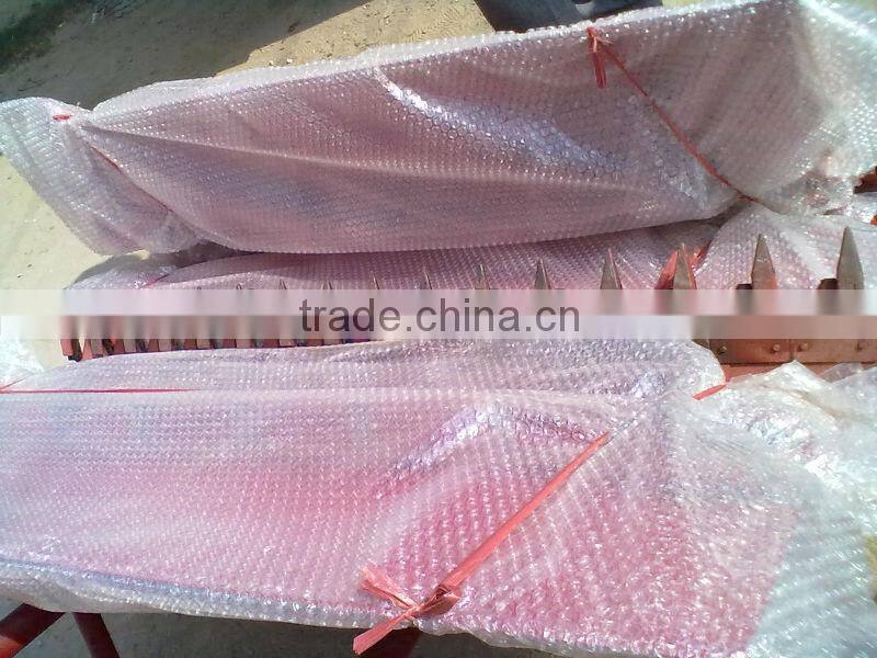 When the machine advances , the crops separated by segregator , and then be cut by cutting knife , the upper and lower conveyor belt the crops out uprightly , under the action of star wheel and weak pressure spring ,the crops into strips on the ground regularly.