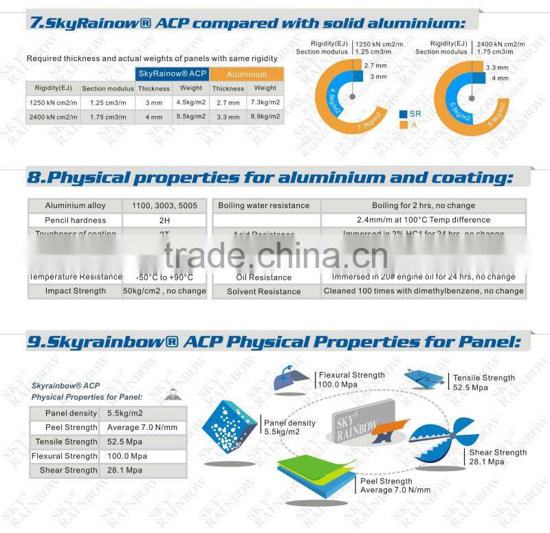 A) Front : aluminium alloy sheet coated fluoro-carbon resin (PVDF) with Nano lacquer B) Core: nontox low density polyethylene C) Back: aluminium alloy sheet coated with polyester resin painting D) Surface coating thickness: 32μ±1μ E) Aluminium alloy: 3003 H24 F) Sheet thickness: 0.3mm,0.4mm,0.5mm | ![]() |