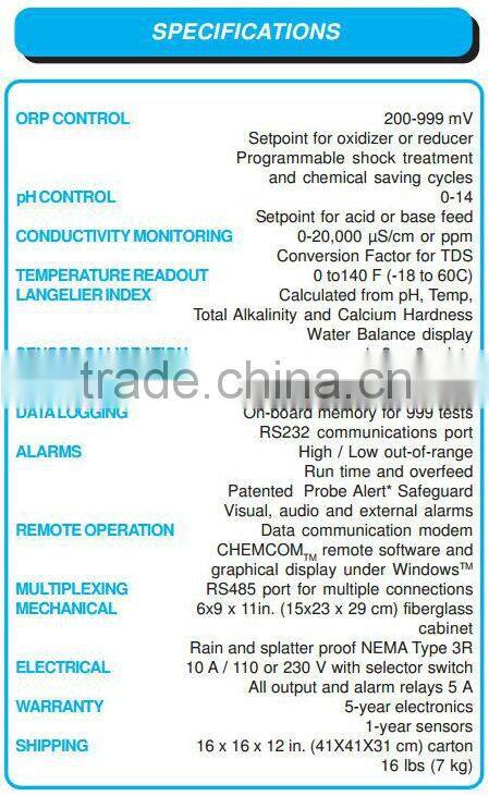 The CHEMTROL® PC2000 is a user-friendly and reliable controller that is easy to install and operate. All menus are displayed in clear language in English, French or Spanish with choice of US or metric units. Every unit is supplied with a comprehensive operation manual plus on-site start-up and training by a Qualified Dealer.
