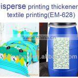1)Printing paste complemented by EM-628 has good color yield, sharp definition.Even under special situation,the paste won’t spray out. 2)Economical to use.Compared to sodium alginate,EM-628 is much cheaper,and reduce cost. 3).To enhance color depth in loop ager for disperse prints,soft hand feeling.