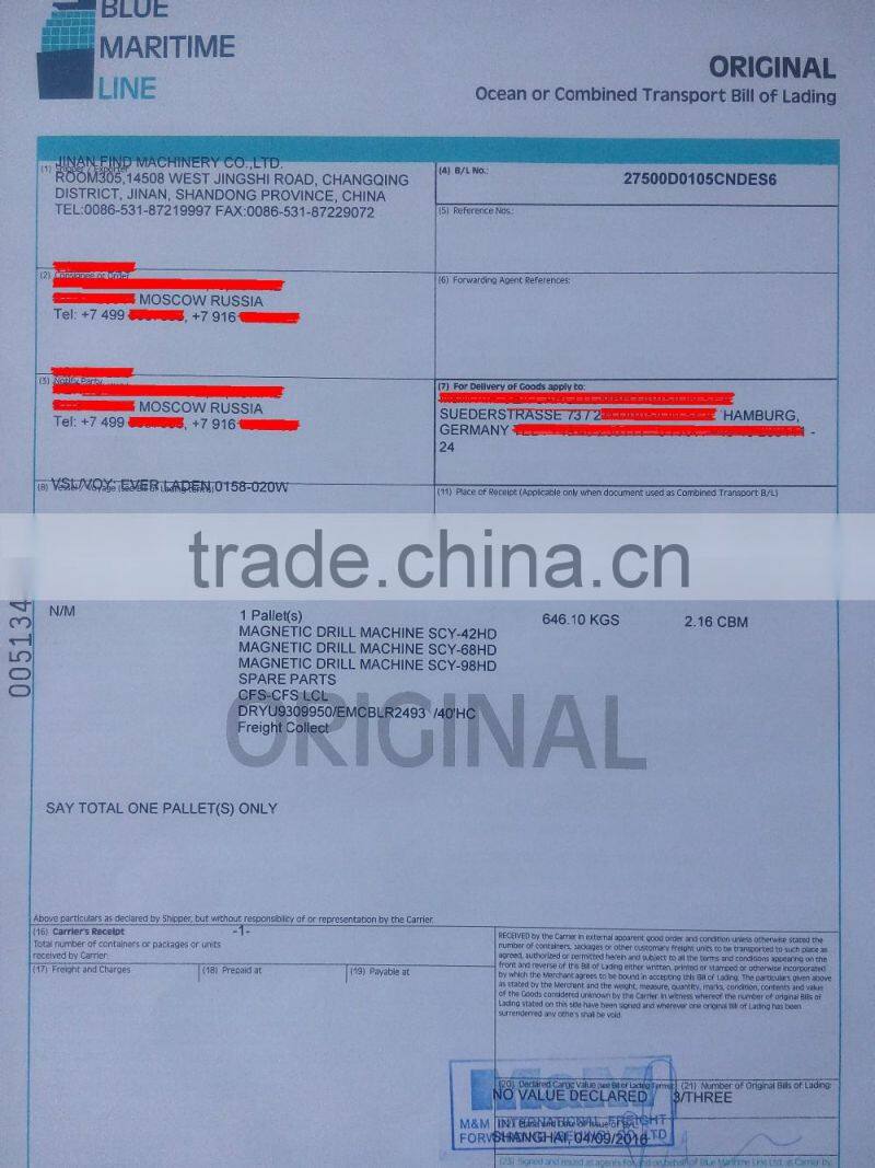 Magnetic drilling machine Bill of Lading
