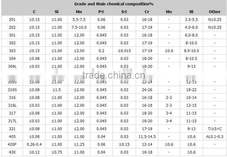 3.Material Grade: 201,202, 301, 302, 303, 304, 304L, 316, 316L, 321, 309S, 309H, 310, 310S, 2205, 405, 410, 416, 420, 431, 430, 430F, 446, 15-5PH, 17-4PH etc.