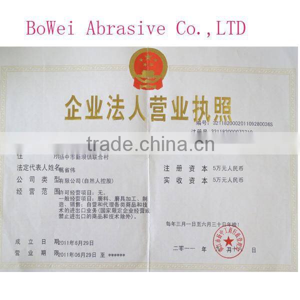 Yangzhong Bowei Abrasives Co., Ltd. is a manufacturer of coated abrasive final products. Our main products cover fiber discs, velcro discs, abrasive cloths, abrasive paper, abrasive belts, self-adhesive products, abrasive paper, abrasive flap discs, industry non-woven products, etc. suitable for surface treatment work of moving rust and scar, grinding, polishing, fining and cleaning, etc.