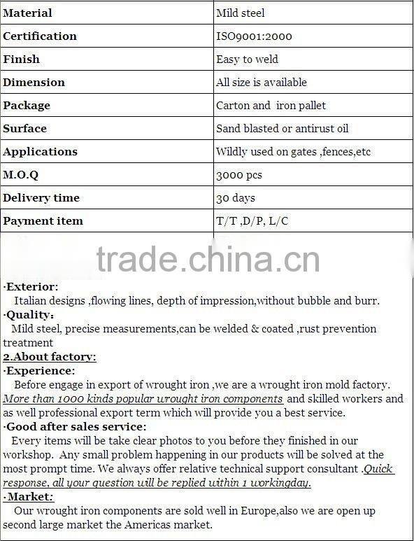 l Our company has more than 20 professional and technical personnel,and 50 workers.We can supply about 2,000 differents items in wrought iron business,so you can buy all the popular patterns in this business.