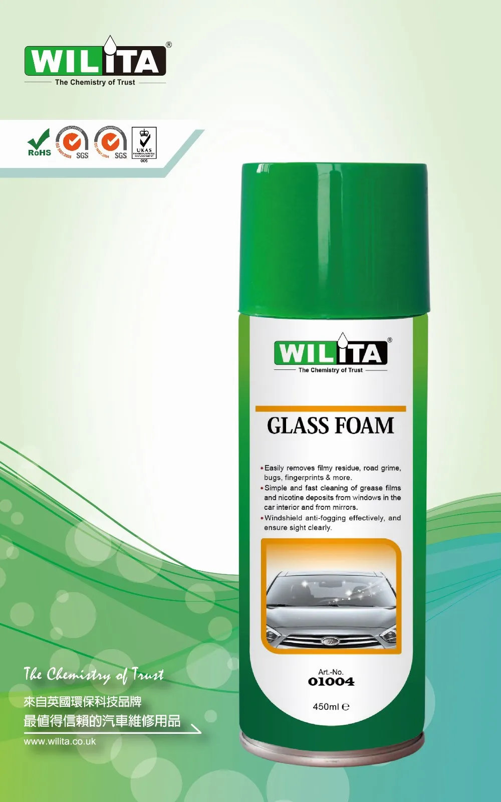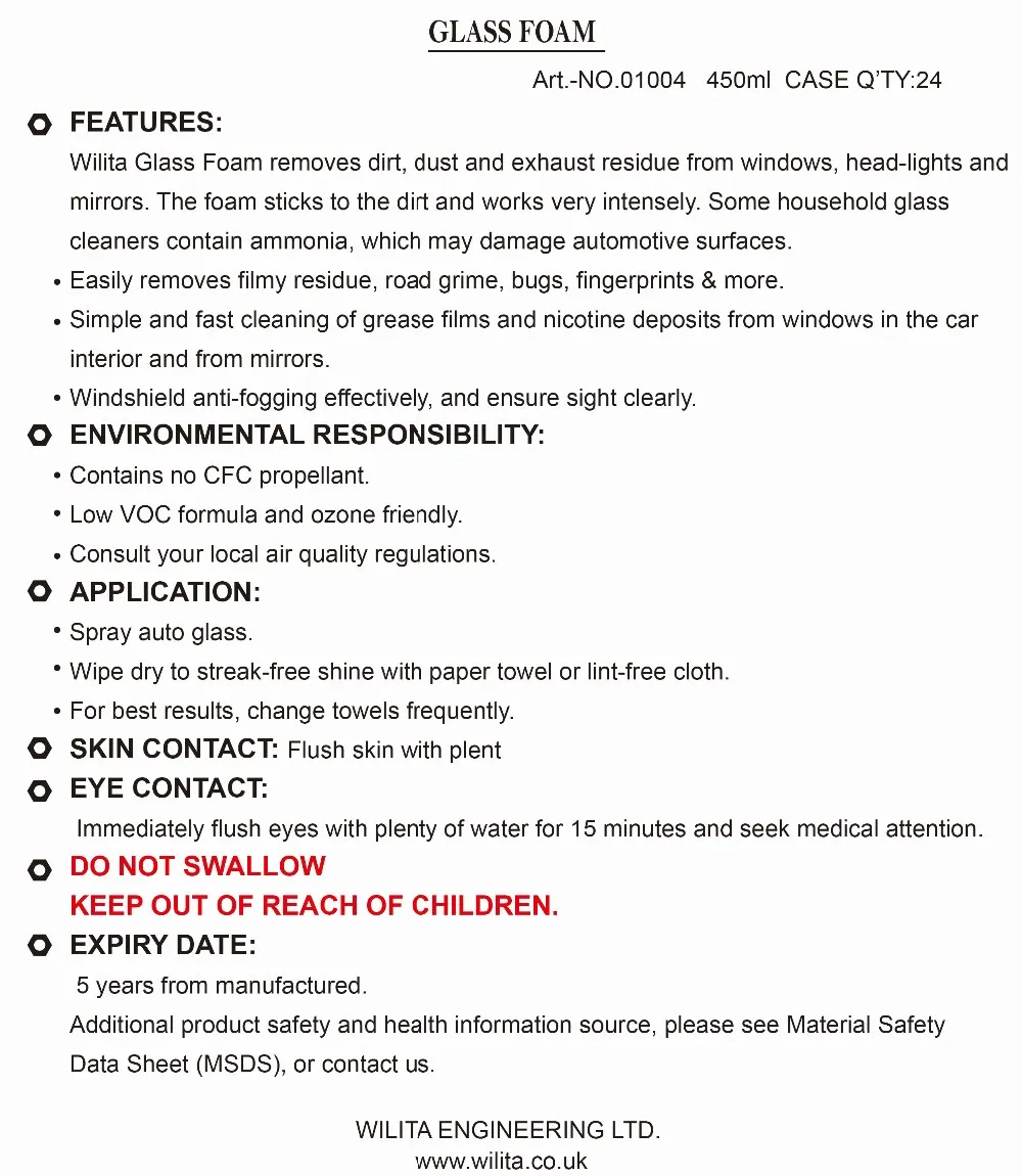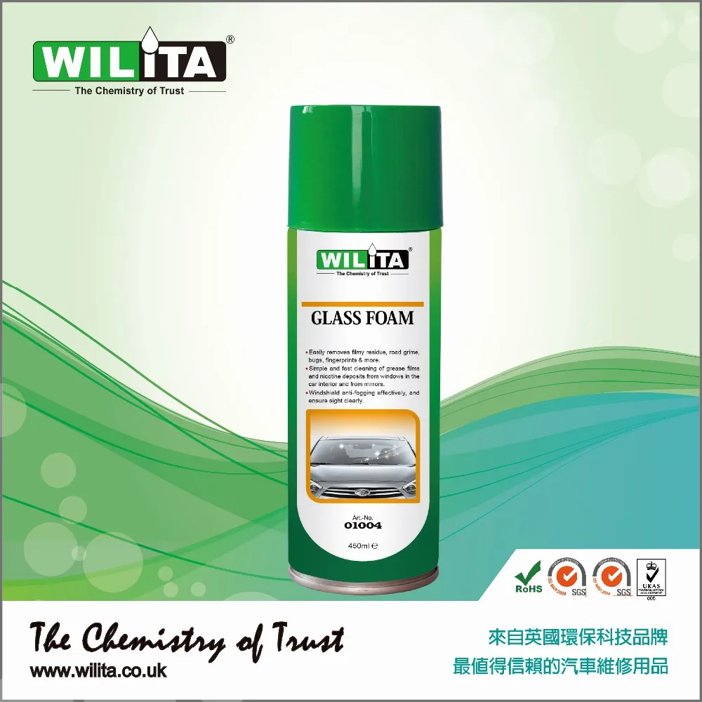 Wilita Foam Glass Cleaner Spray is able to removes dirt, dust and exhaust residue from windows, head-lights and mirrors. The special formulated foam will sticks to the dirt and clean