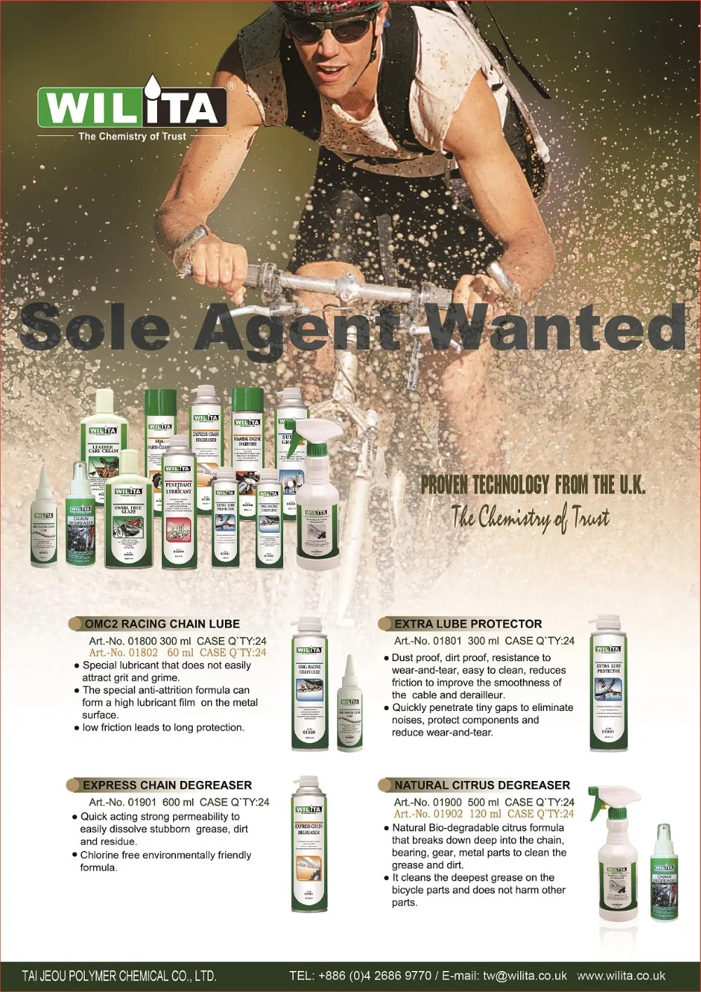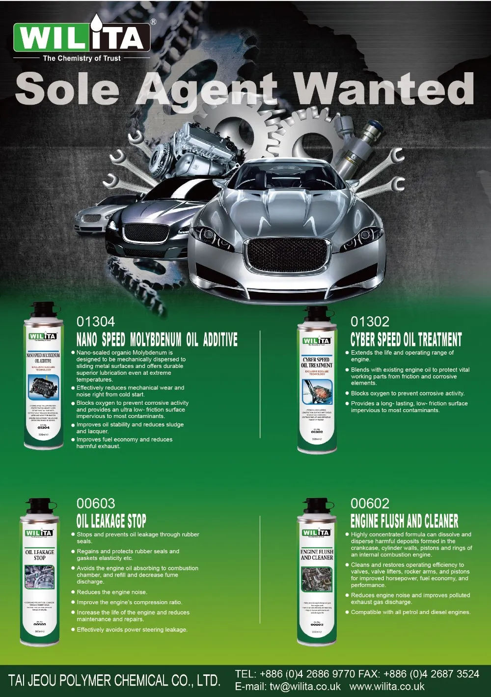 Tai Jeou Polymer Chemical Co., Ltd. is one of the leading manufacturers of vehicle maintenance products. We have been playing a crucial role in the automotive chemical industry since 1973.At the present stage, we are actively developing nano-tech chemical products to further serve the global market. TAI JEOU has already built a series of quality brands with good image earned in the past years, including SPODIN, First, Zittin and Dalis. In the coming days we will anticipate to constantly provide innovative products with brilliant quality as well as outstanding service to the global market. TAI JEOU not only has established owned brands, but also is the exclusive Asian agent of Wilita. Wilita Engineering has built up professional reputation for automotive chemicals and lubricants among the British automotive maintenance community and European car enthusiasts, depending on years of professional expertise in creating solutions for the British racing events at Silverstone.