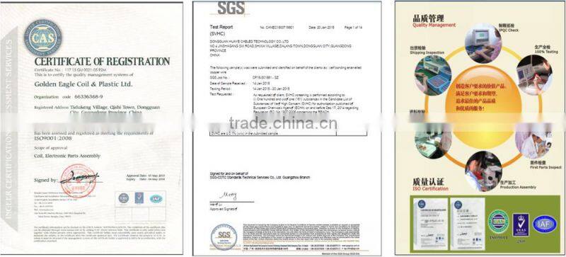 Dongguan Golden Eagle Coil Co., Ltd. ( Golden Eagle Coil & Plastic Ltd) is established in year 2003, at Dongguan city GuangDong Province. In year 2008 , and established branch factory at Pingxiang City Jiangxi province. manufactures inductor coils for access control, radio frequency (RF) products , RI Cut (minitor system and videocon coil, and miniature coils with fine wire winding for hearing aid application and utilizing wet winding process technology. Our miniature coils, miniature plastic injection & over-mold processes are vertically integrated to provide fast, efficient, and cost effective services to our customers. Over the past several years, our company has expanded facilities and resources to provide customers with total manufacturing solutions and turnkey project support to enable large cost savings to customers through reduced labor costs, reduced floor space requirements and value added assembly. We have industrial experience, technical expertise, and our dedicated and experienced engineering team can deliver a variety of innovative solutions to our customers. Our Cost, Services & Quality are proven by our customers and we believe it is the best in the industry. Our Vision At Golden Eagle, our vision is to be a leader in miniature voice coil and miniature plastic injection molding. We aim to achieve our vision through round-the-clock customer service, competitive pricing, defect-free quality products, innovation and flexibility. Our Mission We want to delight our customers by reducing costs, improving quality, and providing value added and innovative services. Benefits to Our Customers -Round the clock (24-7) sales team support -We communicate in English both written and spoken -History of delivering in excess of 20% cost saving to our customers -Exceptional product quality history -Innovative solutions delivered to all our customers -Flexible manufacturing process and staff -Continuous focus on cost reduction and innovation Services We offer -All of your inquiries will be replied you within next day -Cost reduced (labor and material savings) -Outsourcing final assembly option so customers can free up floor space for new products -Miniature plastic injection & over-molding -Miniature precision voice manufacturing -Value added assembly Quality -Our products are manufactured to the highest quality and reliability -Our company is ISO9001 certified -On time SPC program, GR & R & FMEA -It is our management commitment to put our priority on customers' success, needs and satisfaction by innovation and continuous improvement in the quality of our products and services. We hope our services will be useful to your organization and we look forward to hearing from you soon.
