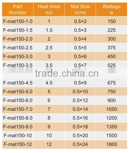 150W/m2 provided for customers choose .At 80W/m2 the electric heating system can be used as a Primary Heat source,or just for floor warming