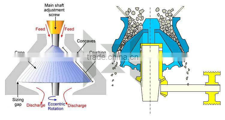 Cone crusher is similar in operation to a gyratory crusher, with less steepness in the crushing chamber and more of a parallel zone between crushing zones. Cone crusher breaks rock by squeezing the rock between an eccentrically gyrating spindle, which is covered by a wear resistant mantle, and the enclosing concave hopper, covered by a manganese concave or a bowl liner. As rock enters the top of the cone crusher, it becomes wedged and squeezed between the mantle and the bowl liner or concave. Large pieces of ore are broken once, and then fall to a lower position (because they are now smaller) where they are broken again. This process continues until the pieces are small enough to fall through the narrow opening at the bottom of the crusher.
