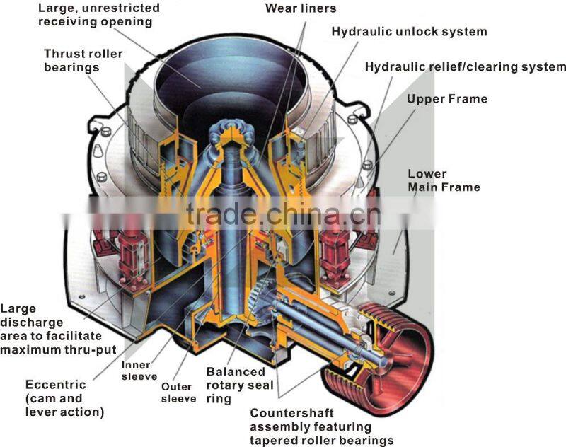 Cone crusher is suitable for crushing a variety of mid-hard and above mid-hard ores and rocks. It has the advantage of reliable construction, high productivity, easy adjustment and less cost in operation. The spring release system of a cone crusher acts an overload protection that allows tramp to pass through the crushing chamber without damage to the crusher
