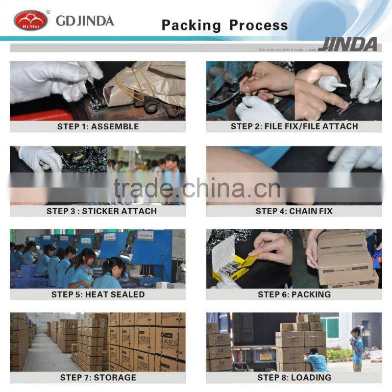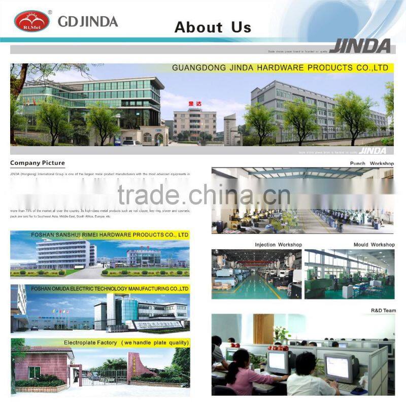 Established in 1997, Guangdong Jinda Hardware Products Co., Ltd. is the largest daily use metal products factory in China. We offer over 4000 models of nail clippers,tweezers,nail file ,pedicure file, nipper keychains, scissors, bottle openers ,Flashlight,pockit knie and multi-functional knife and kitchen tools and beauty care items, also suitable for promotional purposes. We were the first supplier in this industry to obtain an ISO9001:2000 certificate in mainland China. Each month, our 90,000-square-meter factory with more than 3,000 employees turns out 22 million units, which enables us to handle volume orders. Delivery takes 35 days only we use advanced techniques in designing, molding, punching, casting, heat treatment, electroplating, polishing, grinding and packaging. And our lineup of advanced inspection equipment includes Rockwell sclerometers and Vickers hardness testing machines. Join the satisfied buyers from Eastern Europe, the Americas, Asia and the Middle East to source from our nine brands - Rimei, Omuda and Qiangren ,Bazo ,yangni, Omeika ,bolang. sunnice,JINZIMENG. Contact us today for inquiries and distributorship in your market. OEM/ODM orders are welcome.