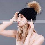 Wholesale Fashion Winter Knitted Wool Beanie Hats With Raccoon Fur Pom Pom Beanie Hat